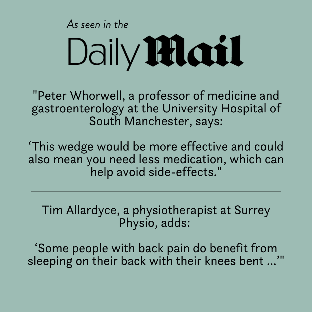 The bed wedge section of the product has been shaped to provide support for the back. The shape also mimics the zero gravity position which is used by astronauts during launch to minimise the strain placed on the body. The product is particularly popular with people who have had spinal issues (including surgery) and are finding it very uncomfortable to sleep flat.