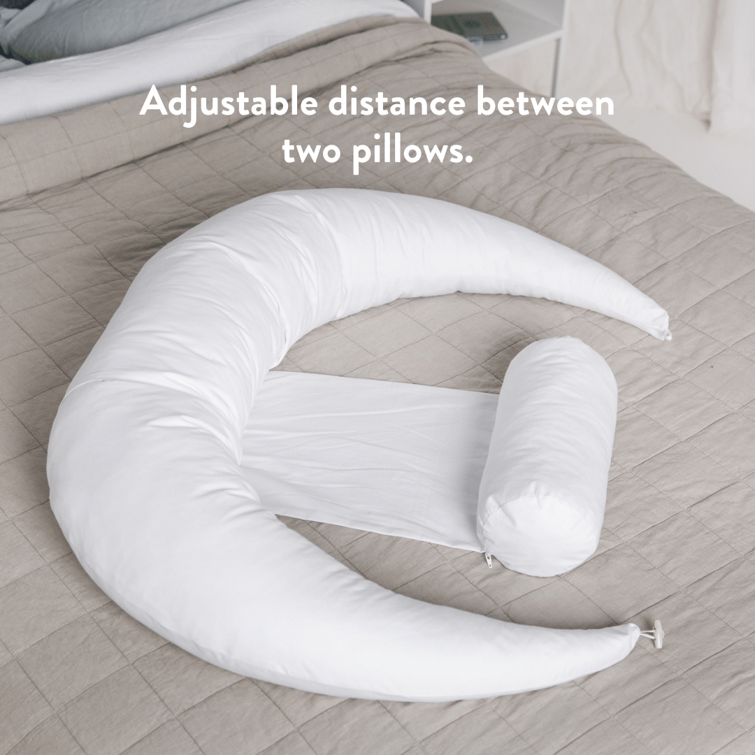 The moon shaped pillow can be used in bed as a cradling support pillow whilst the removable roll supports your bump. You can also use the pillow as a back rest with neck support, during feeding both whilst lying down and sat up, for tummy time, as a lumbar support and many more ways.