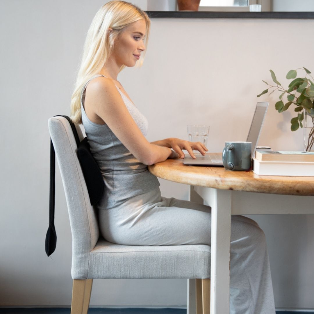 Simply place the Rest-a-Back over the back of your chair and adjust up or down until maximum support is felt in your lumbar region. The simple counterbalance will hold the posture cushion in place so there is no need to keep adjusting it.