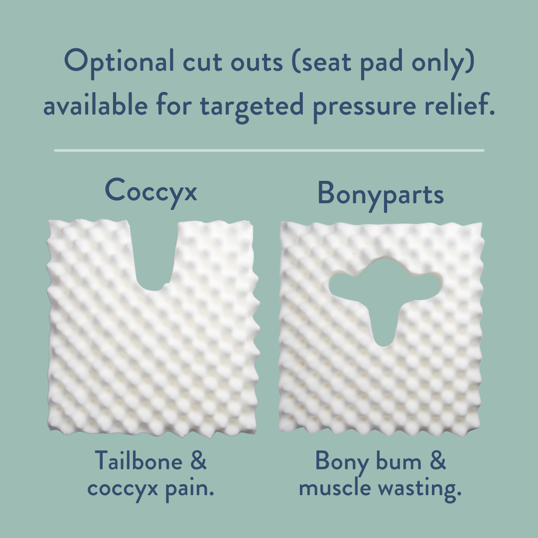 Seat cushion is also available with a coccyx or bonyparts cut out. We only recommend these if you have a particular problem in that area.