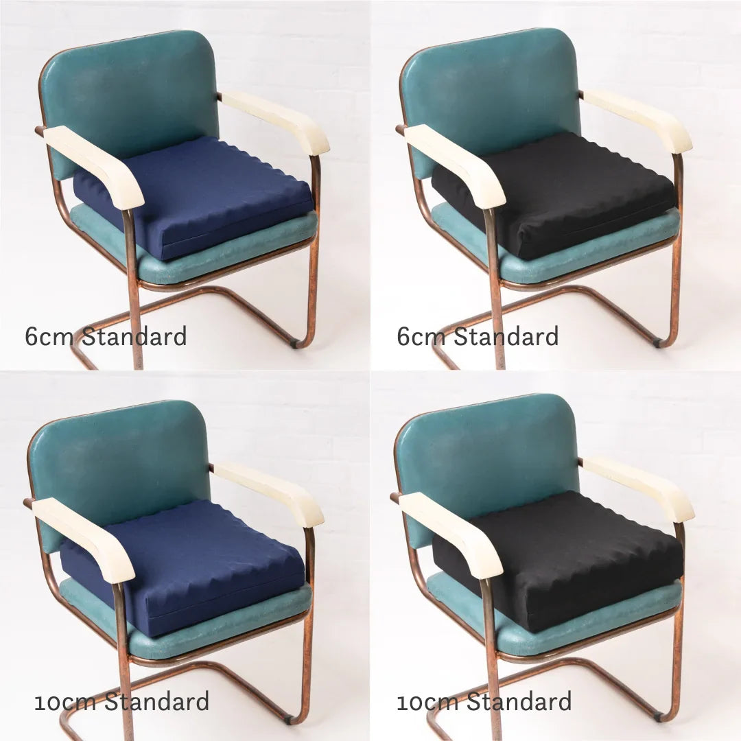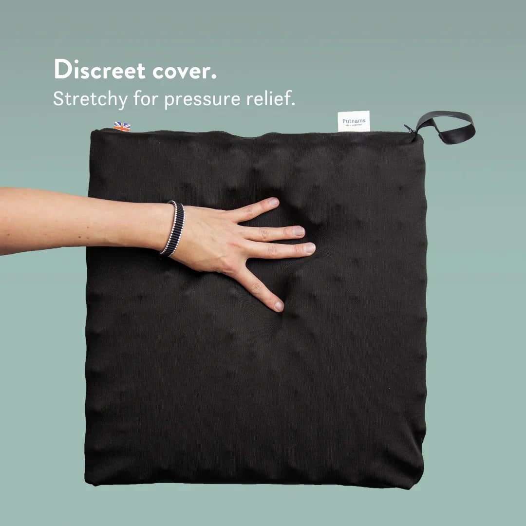 The Sero Pressure Bonyparts Cushion has a T shaped cut-out to reduce pressure on the sitting (sitz) bones. The wave design evenly distributes pressure.  A stretch, removable, washable cover makes the cut-out very discreet suitable for a busy office, public transport or similar.